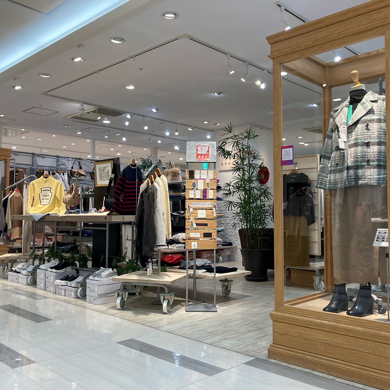 TOMORROWLAND、PUPULA、PASSIONE、BRAHMIN等の国内のブランドからモンクレール、タトラス等のインポートも充実し、デザイン性のある良質な旬のアイテムを