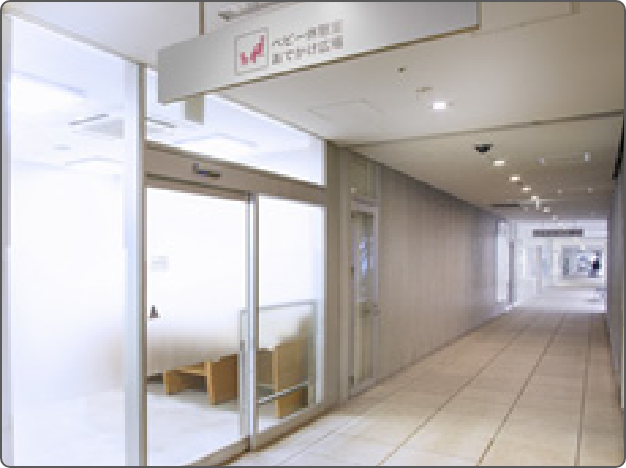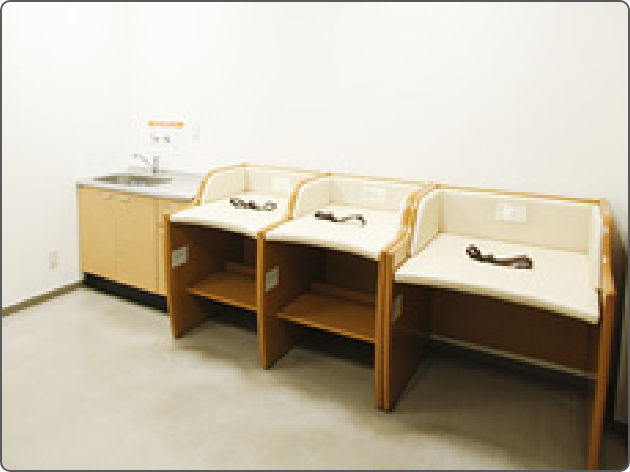 お子様のオムツ交換用のベッドや、授乳室(女性のみ入室可能)、休憩用ソファーを設置しております。また、ミルクが作れるように温水のでる浄水機付きのシンクを設置しております。