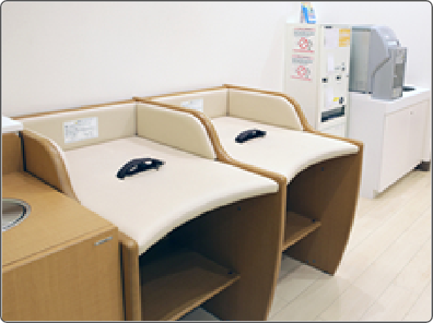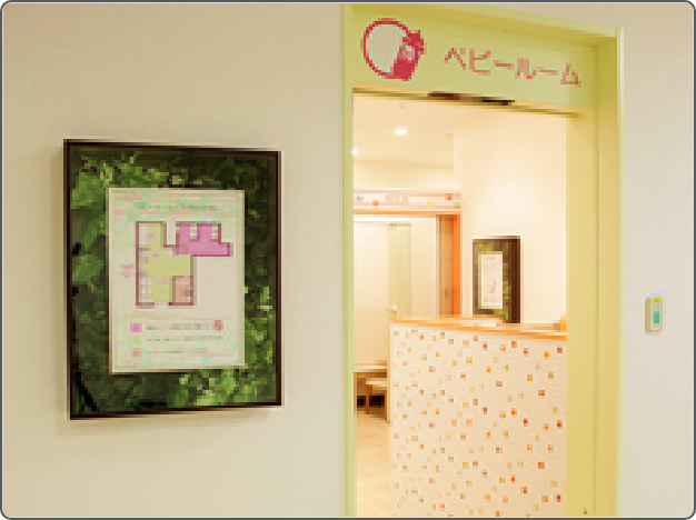 おむつ替えベッドや授乳室を設置したベビールーム他、3Fから8Fの各フロアにおむつ替えシート付きトイレを設置しております。